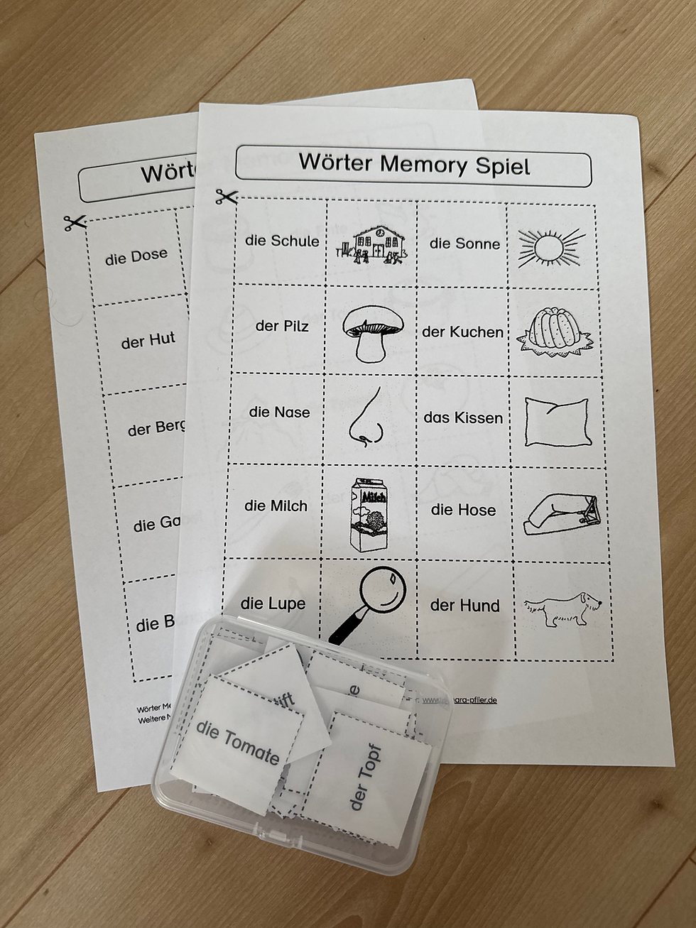 Die Karten werden verdeckt ausgelegt und passende Paare (Wort + Bild) gesucht.
